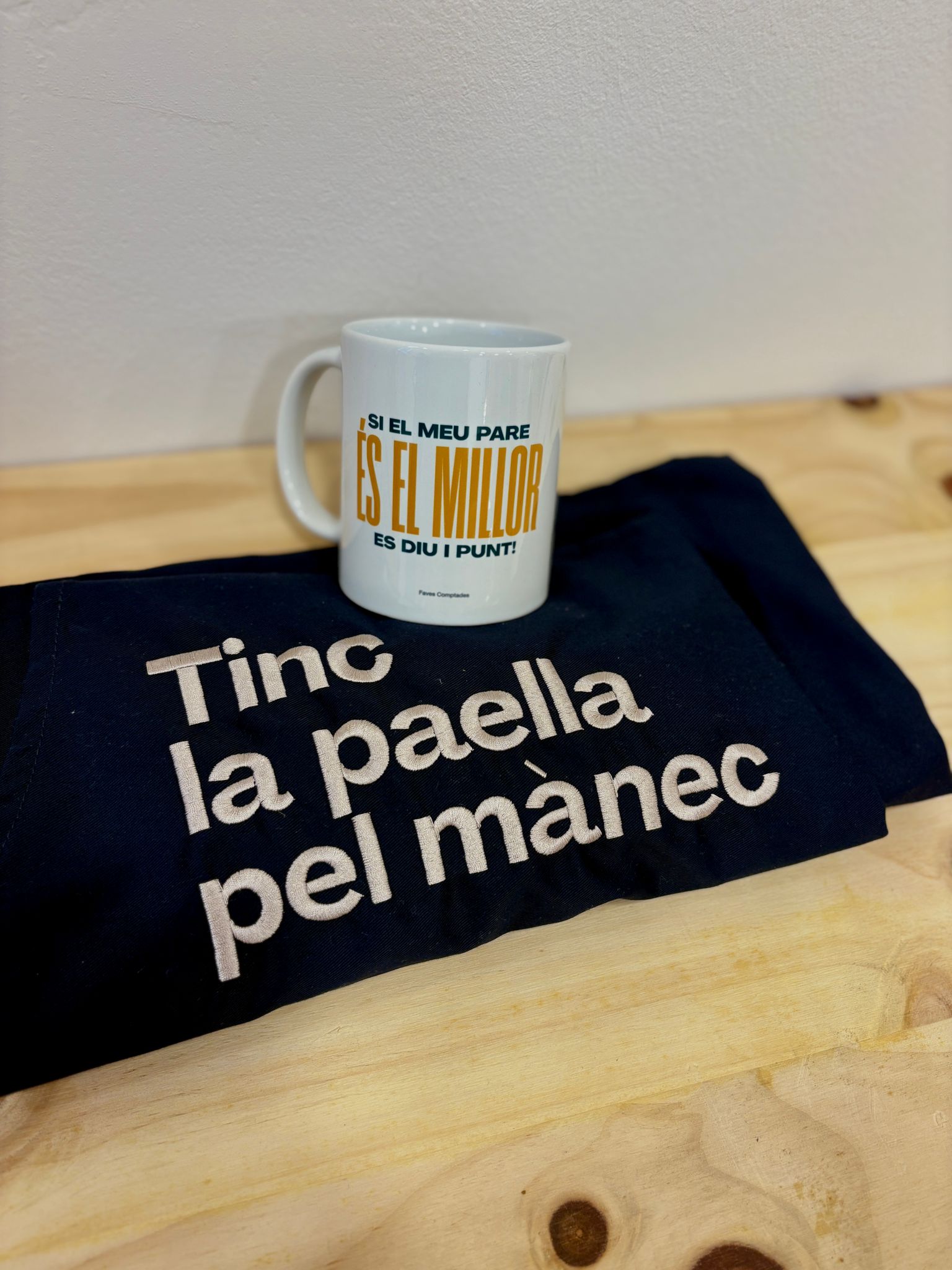 Aquest pack combina la tassa “Pare” amb el davantal “Tinc la paella pel mànec”, un regal que diu “ets el millor” sense necessitat d’embolicar-ho massa.